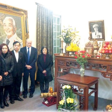 Dịch giả Đỗ Hùng (ngoài cùng, bìa trái) và Giáo sư Larry Berman (người thứ 4 từ trái sang) tại nhà cố Đại tướng Võ Nguyên Giáp – Ảnh: First News